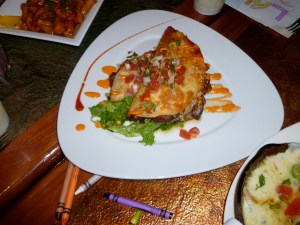 Okay, back to that food. Very, very good. The photo above was taken solely because I have never seen a quesadilla quite that beautiful. All of the dishes were that well thought out, not just the aesthetics but the flavor, too! I have to give Chef Jeff Richard snaps for putting as much care into the appetizers as he does to the Sea Bass special (incredible!) and the Kobe Top Sirloin (also, incredible!). The kitchen at the OSC continued to turn out consistently beautiful, flavorful, well cooked dishes to our large party. If you stop in I would definitely give the Sweet and Sour Calamari and Pepperjack Queso Fundito (made with crab meat!) a try. Our adorable waitress knew absolutely everything about the menu (including the rather elaborate Specials), was happy to recommend a good wine, keep our glasses filled and stayed close without hovering. Also, the children’s meals were really good. I can get a little rumpled if I have to pay for dinner out and still go home and feed my kiddos because they didn’t get enough to eat or didn’t care for the greasy, bland chicken nuggets that usually grace the Kid’s Menu. Well, no problem here, both meals were prepared with the same attention all the other dishes received, with plenty of fresh made fries on the side, Yeah, Baby!
