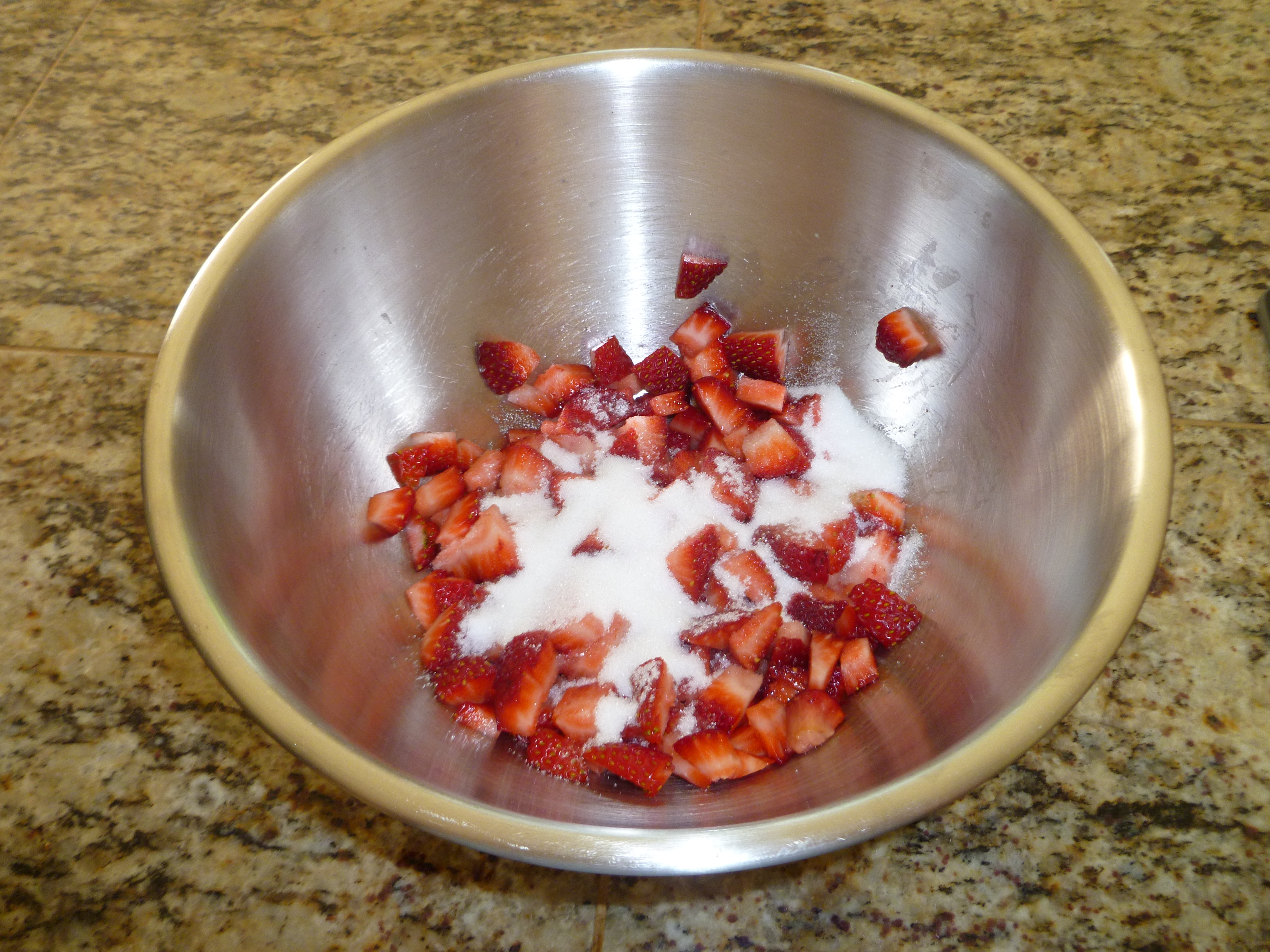 I like to begin with the sauce to give the strawberries plenty of time to release all of that delicious juice. Place berries, sugar, and lemon juice in a mixing bowl and mix gently. Set aside. (By the way, this also works great with other kinds of berries and makes a mean sauce, which our family l-o-v-e-s over ice cream)